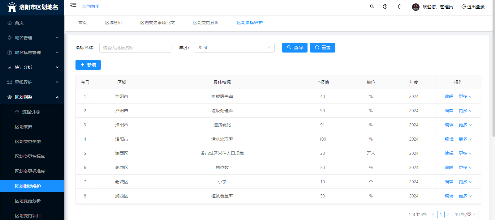 區劃調整:區劃數據、區劃變更類別、區劃變更指標庫、區劃指標維護、區劃變更分析、年度區劃變更表、區劃變更事項批復文件、歷史文件上傳