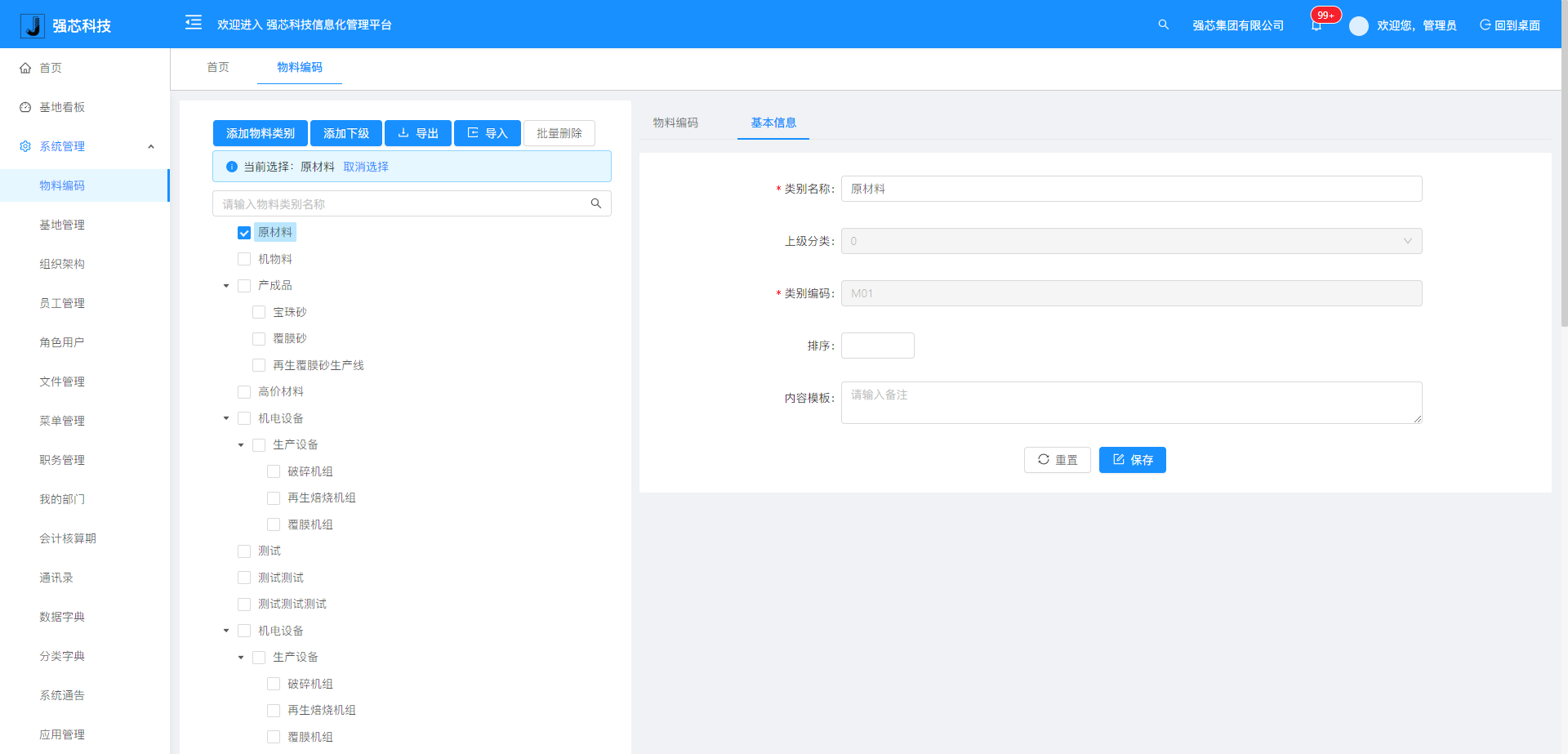 系統設置:物料編碼、基地管理、組織架構、員工管理、角色用戶、菜單管理、職務管理、會計核算期、授權設置